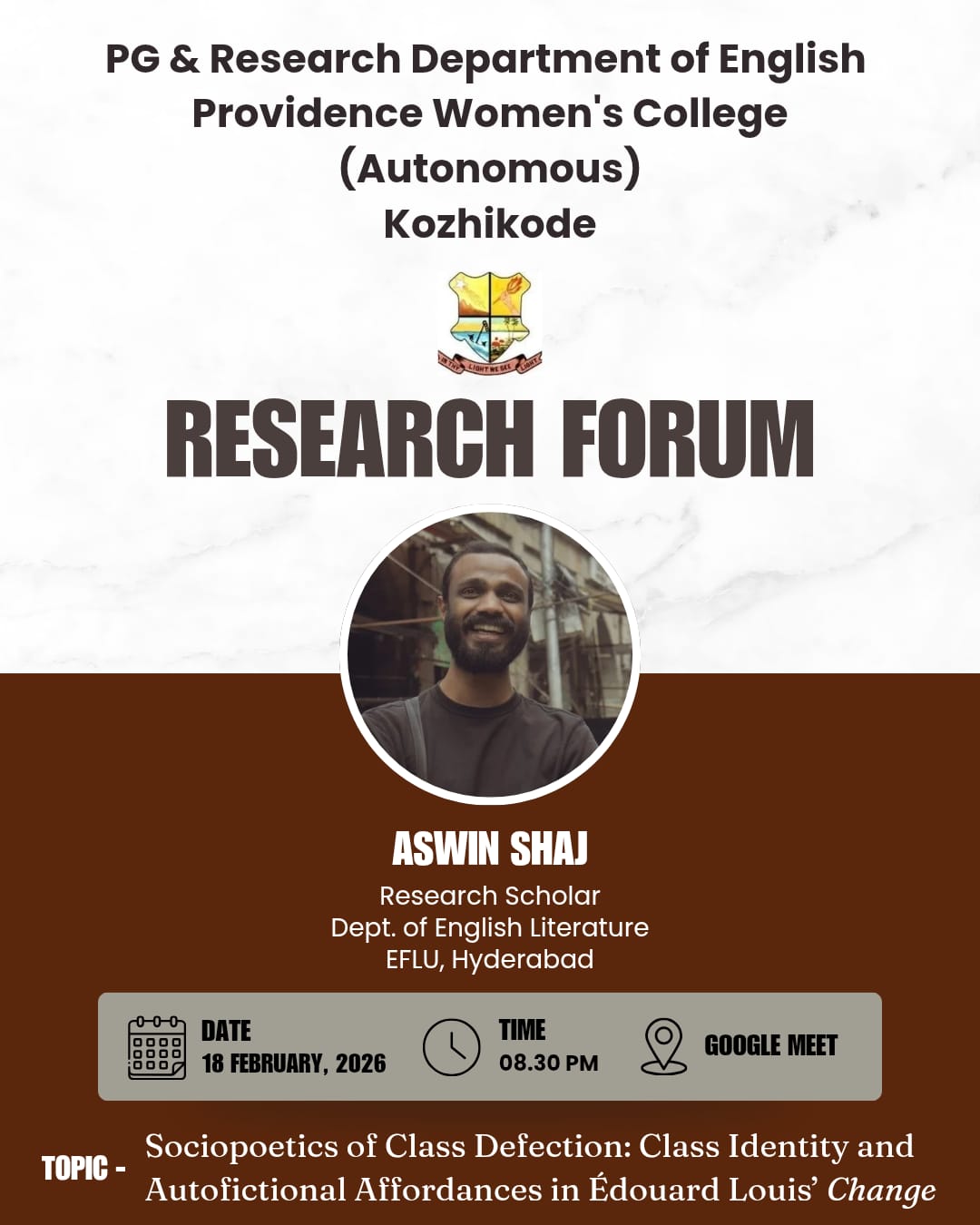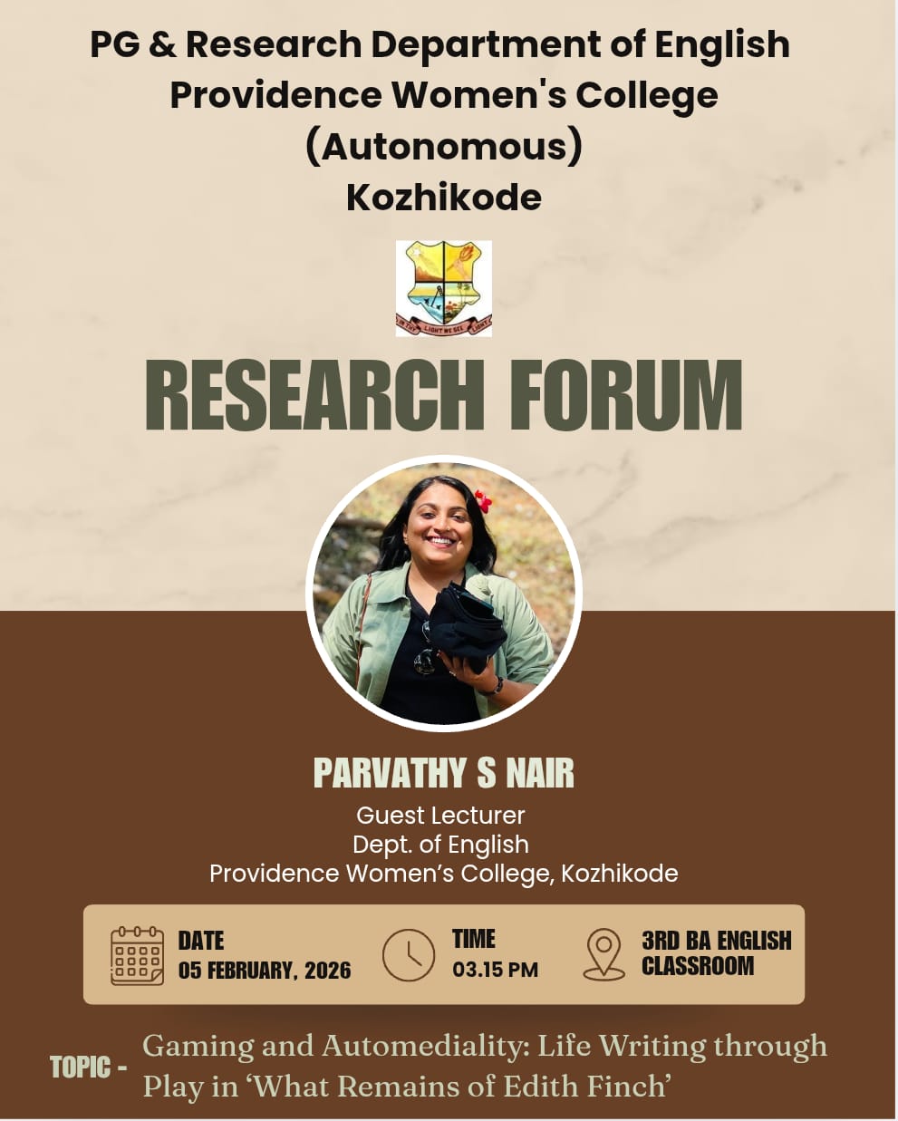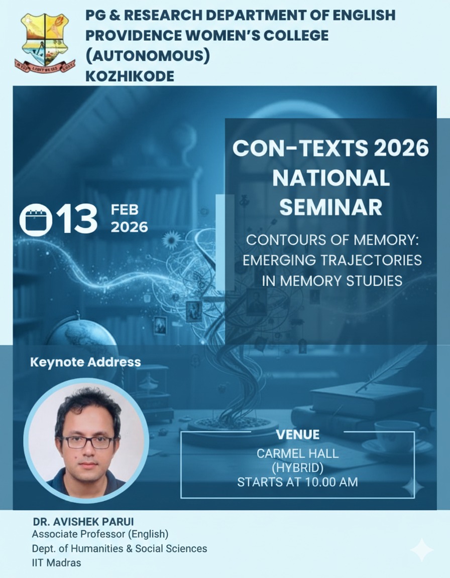 CON-TEXTS 2026 – Seminar Report The annual seminar of the PG & Research Department of English, Providence Women’s College (Autonomous), Kozhikode, CON-TEXTS 2026, was conducted on 13 February 2026 as a one-day national seminar on the theme Contours of Memory: Emerging Trajectories in Memory Studies. The keynote address was delivered by Dr Avishek Parui, Associate Professor of English, Department of Humanities and Social Sciences, Indian Institute of Technology, Madras. The inaugural session also featured felicitations by the Principal, Dr. (Sr). Jaseena Joseph, and Dr Shanthi Vijayan, Head of the PG & Research Department of English. The keynote lecture was followed [...]