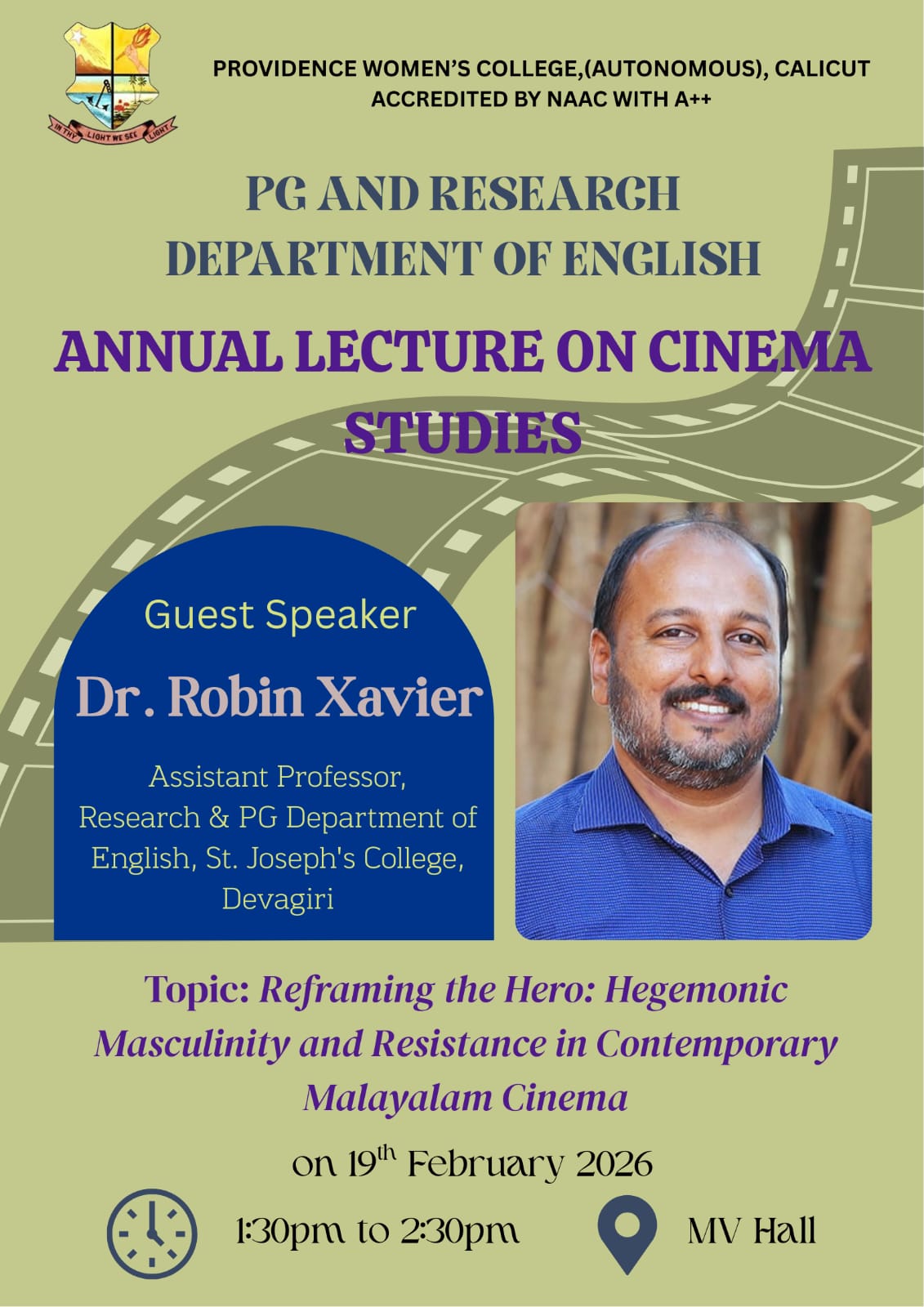 The Annual Lecture on Cinema Studies for 2025-26 was delivered by Dr. Robin Xavier, Assistant Professor, Research and PG Department of English, St. Joseph's College (Autonomous), Devagiri on 19th February 2026 at 1.30 pm in the MV Hall. The lecture was titled, "Reframing the Hero: Hegemonic Masculinity and Resistance in Contemporary Malayalam Cinema" and explored areas including Representation in Cinema, Representation of the Male (Hero) in Malayalam cinema, Caste in Cinema – Hegemony/Homogenization of Identities, Toxic and Sensitive Masculinities and Subordinate Masculinities: Dalit, Muslim & non-Syrian Christian Representations in cinema.