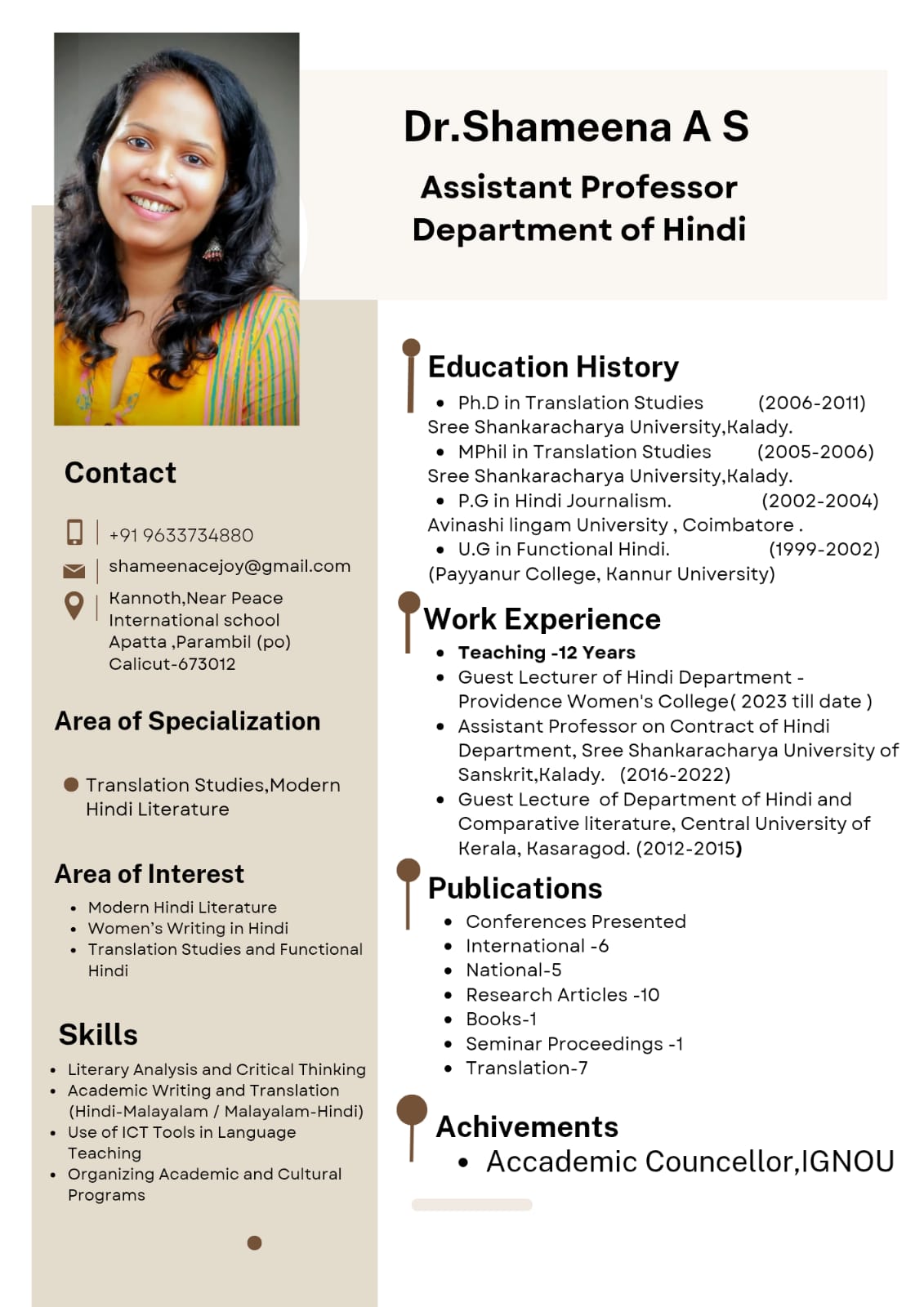 Hindi department was started in the year 1953. Dr.M.Radha Devi was the first teacher in the department. Since 2008 the annual system of education changed and semester system introduced. Now the department was smoothly going with the curriculum. Department observes days like Premchand Day ,Hindi Fortnight Celebration, Reading Day etc.