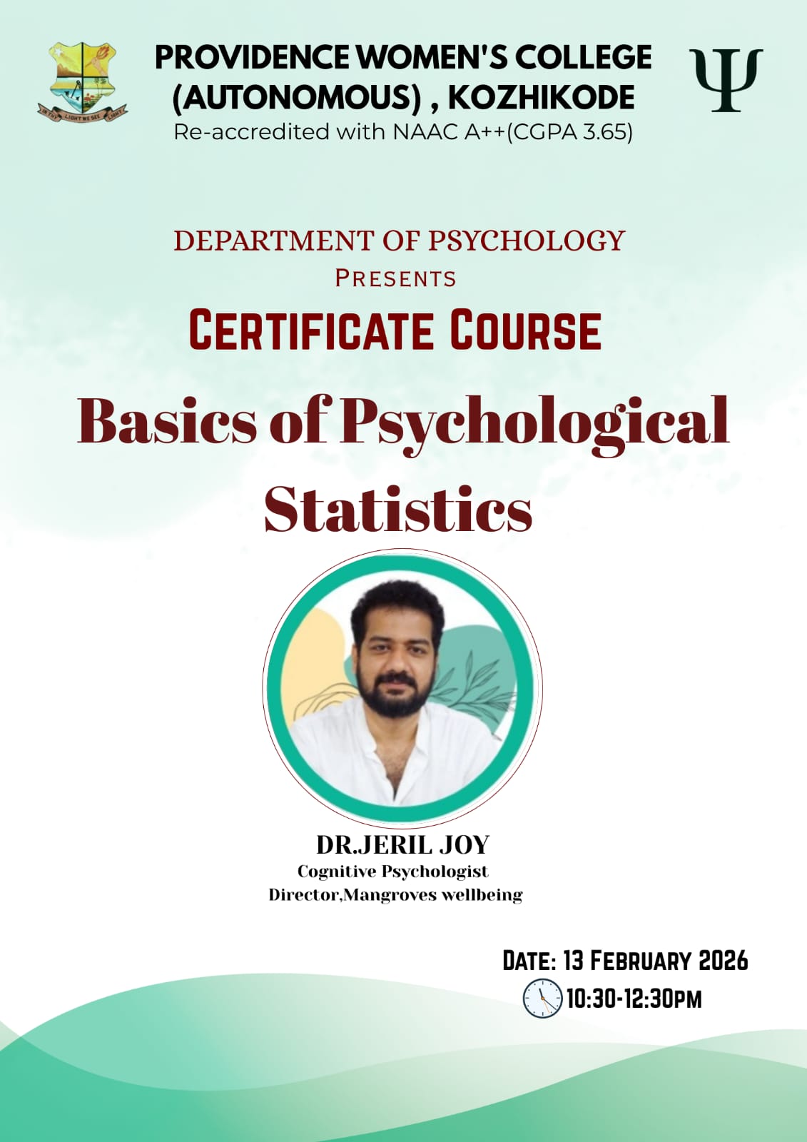 A Certificate Course on “Basics of Psychological Statistics” was organized by the Department of Psychology in collaboration with Mangrove Wellbeing Private Limited. The programme was conducted by Dr. Jeril Joy, Co-Founder and Director of the organization, on February 13, 2026, for second-year Psychology students.