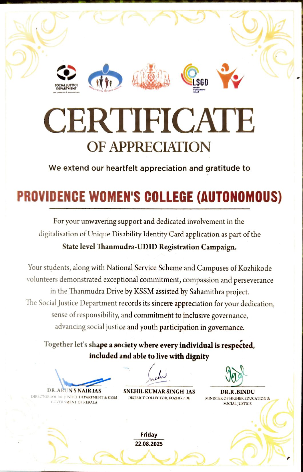 Appreciation for State level Thanmudra-UDID Registration Campaign – NSS