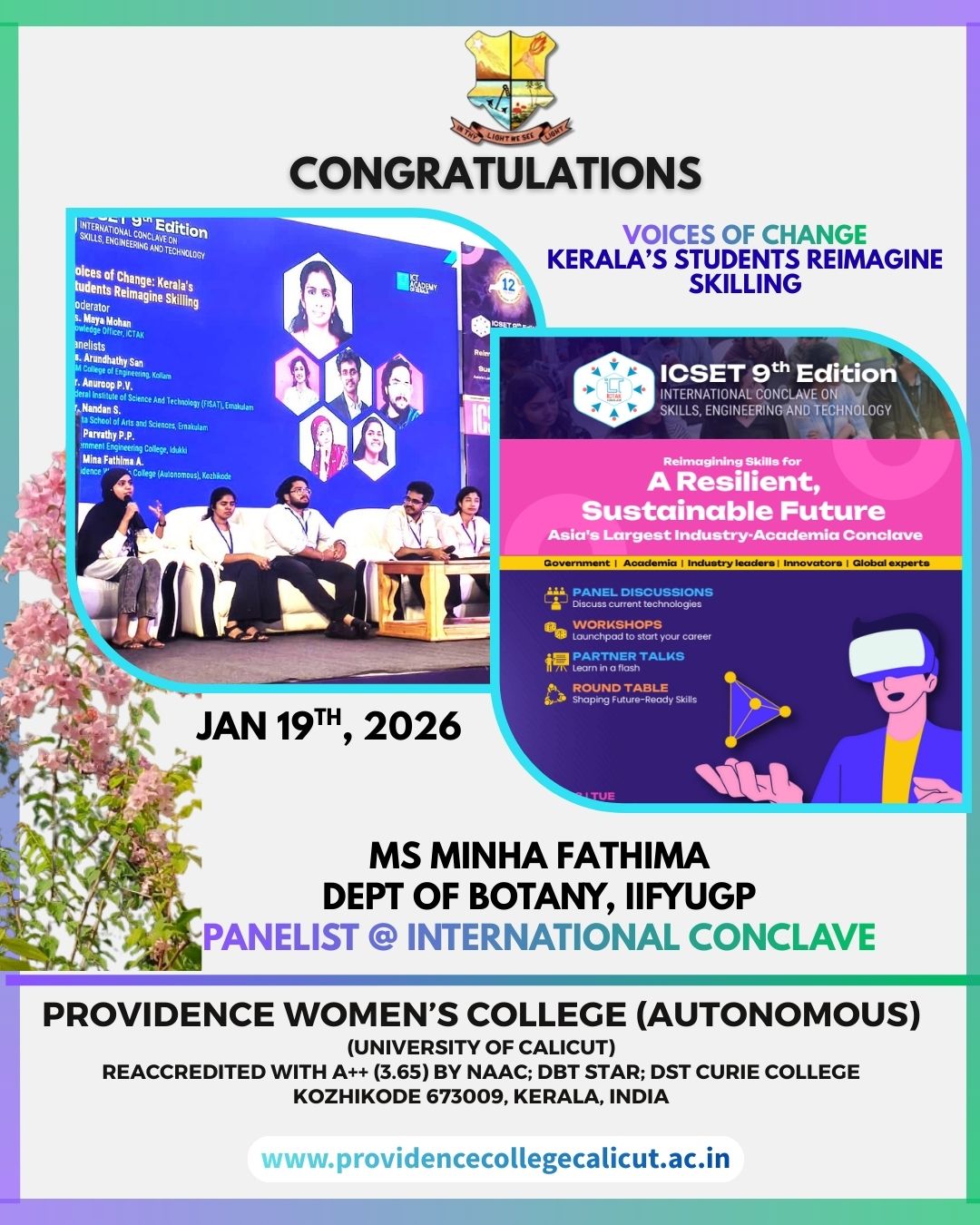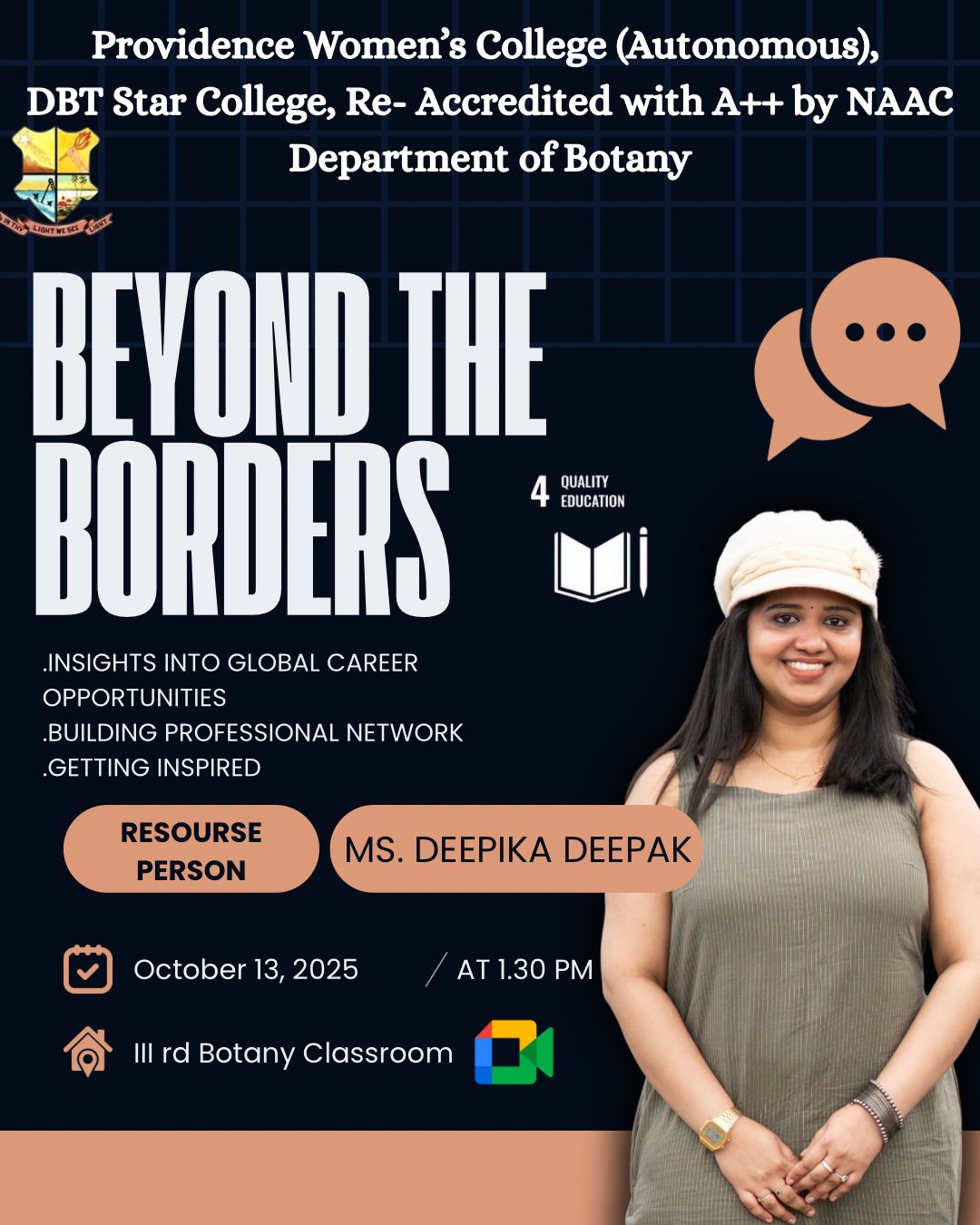 sitemanager2026-01-15T11:59:41+05:30The program “Beyond the Borders” was organized as an interactive session for the Botany students of Providence Women’s College (Autonomous), Kozhikode, on 13 October 2025 at 1.30 pm in the 3rd year Botany classroom. The session was handled by Ms. Deepika Deepak, M.Sc. Food Science and Technology, Teesside University, Middlesbrough, UK, an alumna of Providence Women’s College. She shared her academic experiences abroad, discussed higher education and career opportunities in life sciences, and highlighted the importance of global exposure. The session was highly interactive, motivating students to broaden their academic perspectives and aspire for international opportunities.