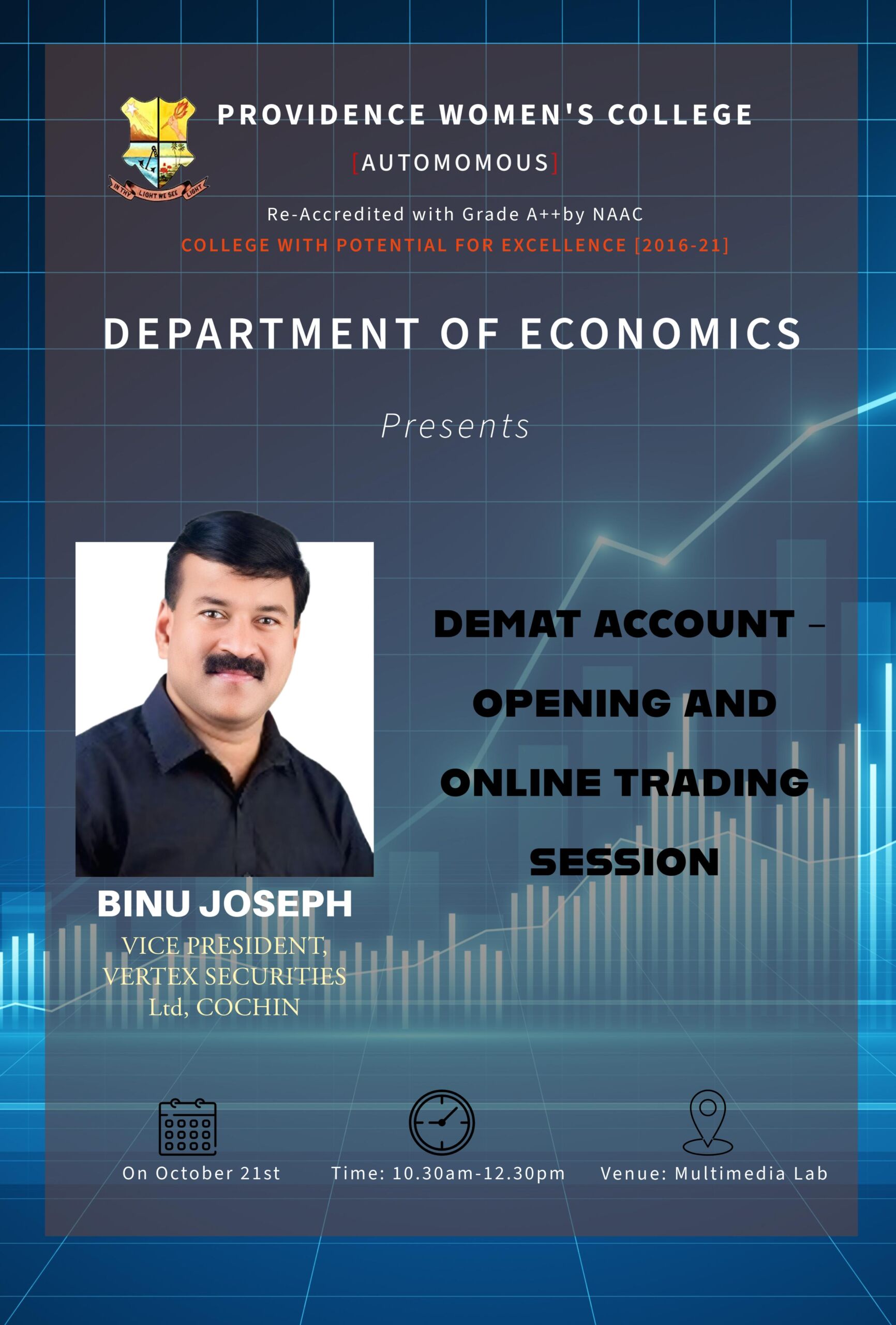 On 21st of october 2024, a Demat account opening and a live online trading session was organised by the department of Economics in the multimedia lab of the college. The session was handled by Mr. Binu Joseph ,vice president ,Vertex securities ltd. Cochin.