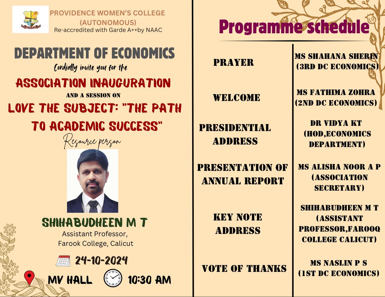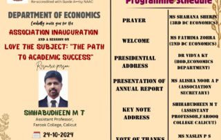 The association inauguration was held on 24th of October 2024 in the MV hall. The association was inaugurated by Mr. Shihabudheen M.T, Assistant Professor, Farooq College, Calicut. Thereafter was a session on the topic,”Love The Subject: The Path To Academic Success”.