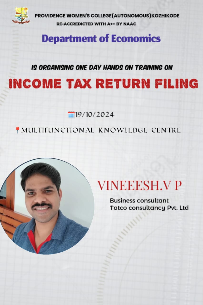 Department of Economics organised a one day Workshop on Income Tax Return Filing on 19th of October 2024. The session was held at the multifunctional knowledge centre at the college and was led by Mr. Vineesh V P, business consultant Tatco consultancy Pvt. Ltd.