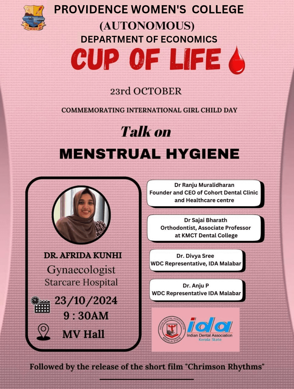 The Department of Economics in association with Indian Dental Association and Starcare Hospital, conducted a talk on Menstrual Hygiene on 23rd of October 2024 at the MV hall. The session was conducted by Dr. Afrida Kunhi,Gynaecologist ,Star Care Hospital Calicut. Also the session was followed by the release of the short film " Chrimpson Rythms."