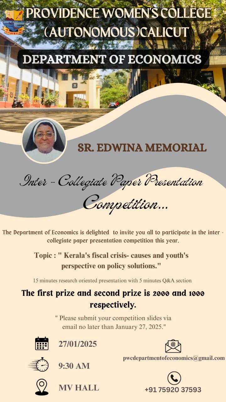 The Edwina Memorial Intercollegiate Paper Presentation Competition, hosted by the Department of Economics on January 27, 2025, focused on the topic “Kerala's Fiscal Crisis - Causes and Youth Perspective on Policy Solutions.” The event offered a platform to explore Kerala’s current fiscal challenges and potential solutions from the viewpoint of the youth. Fr. Dr. John Mariyamparambil, Head and Assistant Professor of the Department of Economics at CKGM College Perambra, Kozhikode, graced the event as the Guest of Honour and Speaker. He shared valuable insights on Kerala's fiscal situation and highlighted career opportunities in economics and public policy. [...]