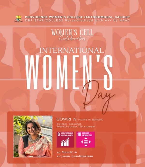 The Women’s Cell of Providence Women’s College organized a special programme to commemorate International Women’s Day on 10 March 2026 at 11:30 AM in the college auditorium. The event aimed to celebrate womanhood, promote gender equality, and raise awareness about the importance of women’s empowerment in contemporary society. The programme was aligned with global development goals, particularly Sustainable Development Goal 8 (Decent Work and Economic Growth) and Goal 10 (Reduced Inequalities). The highlight of the programme was the presence of Gowri N as the Guest of Honour. She is a noted traveller, columnist, research scholar, and TEDx speaker. In her address, [...]
