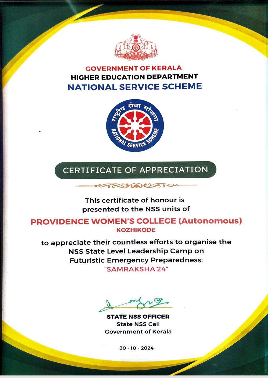 State Level Award for Outstanding contributions in organizing the State Level Leaderships Camp “SAMRAKSHA’24” – NSS