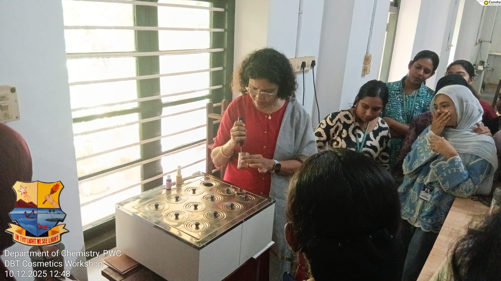 The Department of Chemistry organized “Cosmetics Workshop – Stage II: Hands-on Training & Product Finalization” on December 10, 2025, from 10:30 AM to 3:00 PM. The session was conducted by Dr. Sheeba Veluthoor, Founder and CEO of Core Valleys Herbal Technologies Pvt. Ltd., Kozhikode.