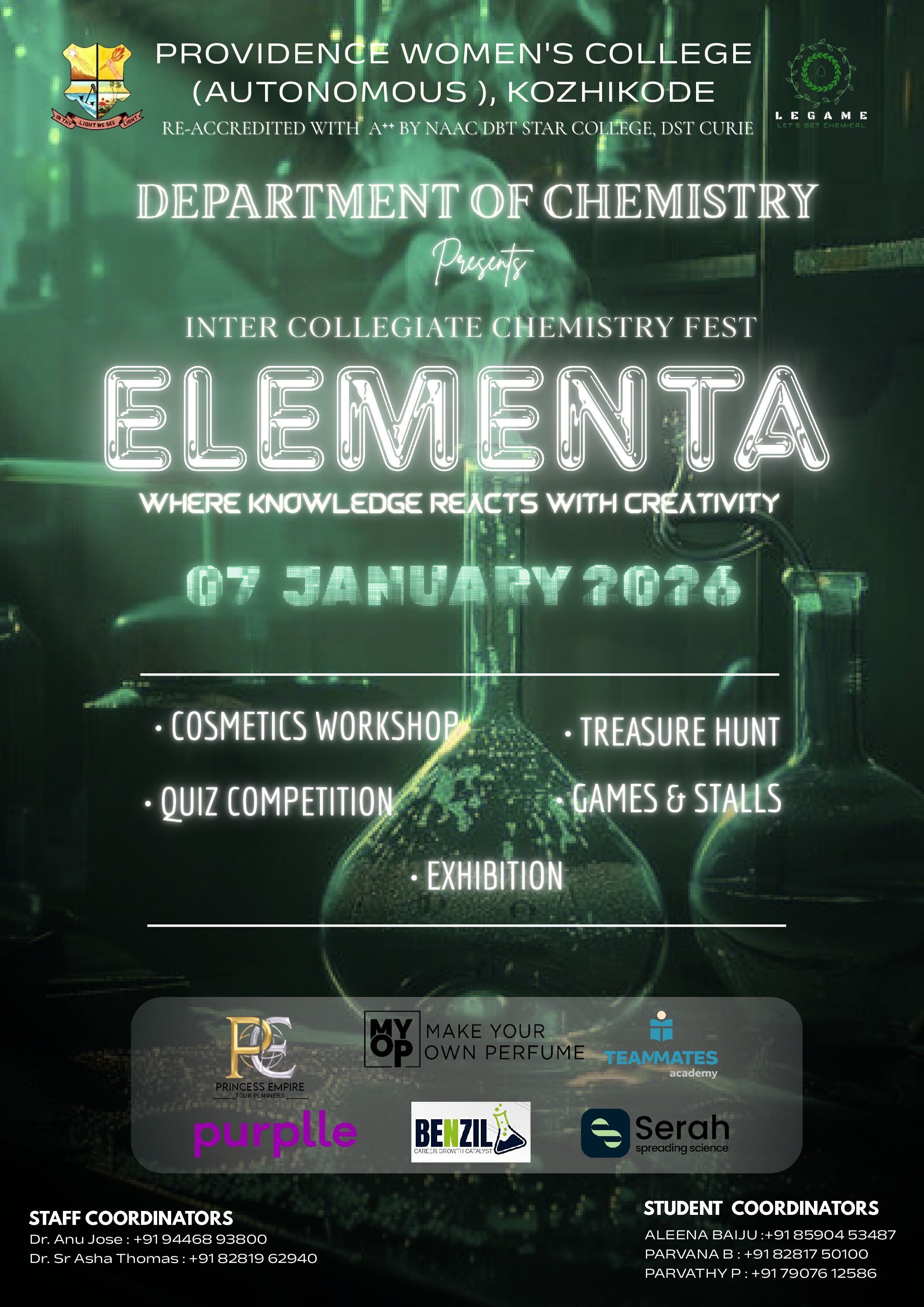 Providence Women's College, Calicut Malaparamba, Calicut, Kerala, IndiaThe Department of Chemistry is organizing an intercollegiate Chemfest titled “Elementa” on 07/01/2026. The programme includes a Lipstick and Lip Balm Making Workshop, Quiz Competition, Games, Exhibition, and several other engaging activities for students.
