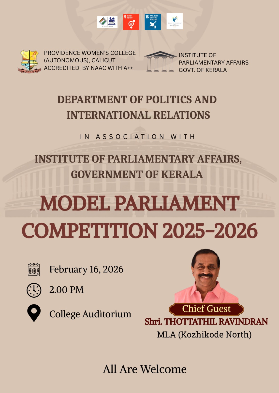 Auditorium Providence Women's College, Malapparamba, Kerala, IndiaThe Department of Politics and International Relations will be organizing a model Parliament performance on 16 February 2026 in the college auditorium as part of the Model Parliament Competition organized by the Institute of Parliamentary Affairs, Government of Kerala. Inauguration by MLA Shri. Thottathil Ravindran.