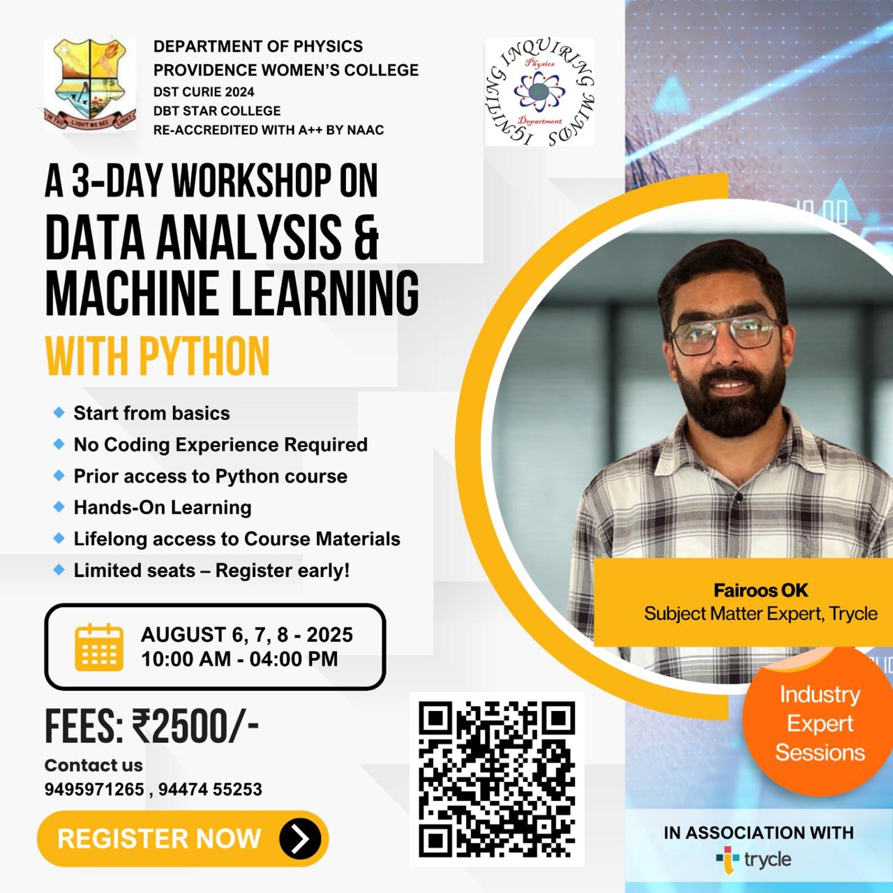sitemanager2025-08-12T15:00:51+05:30Department of Physics organized a 3-day workshop on Data Analysis and Machine Learning with Python from August 6 to 8, 2025, in association with Trycle. The program was conducted at Providence Women’s College, and it witnessed enthusiastic participation from physics students and faculty members of various colleges including those from Providence itself. The inagugural session was graced by Dr. Sr. Ashmitha A.C, Principal of Providence Women’s College, who officially inaugurated the workshop. Dr. Sini, Head of the Department of Physics, also joined the occasion and extended her support throughout the event. Expert sessions were handled by Mr. Fairoos OK, Subject [...]