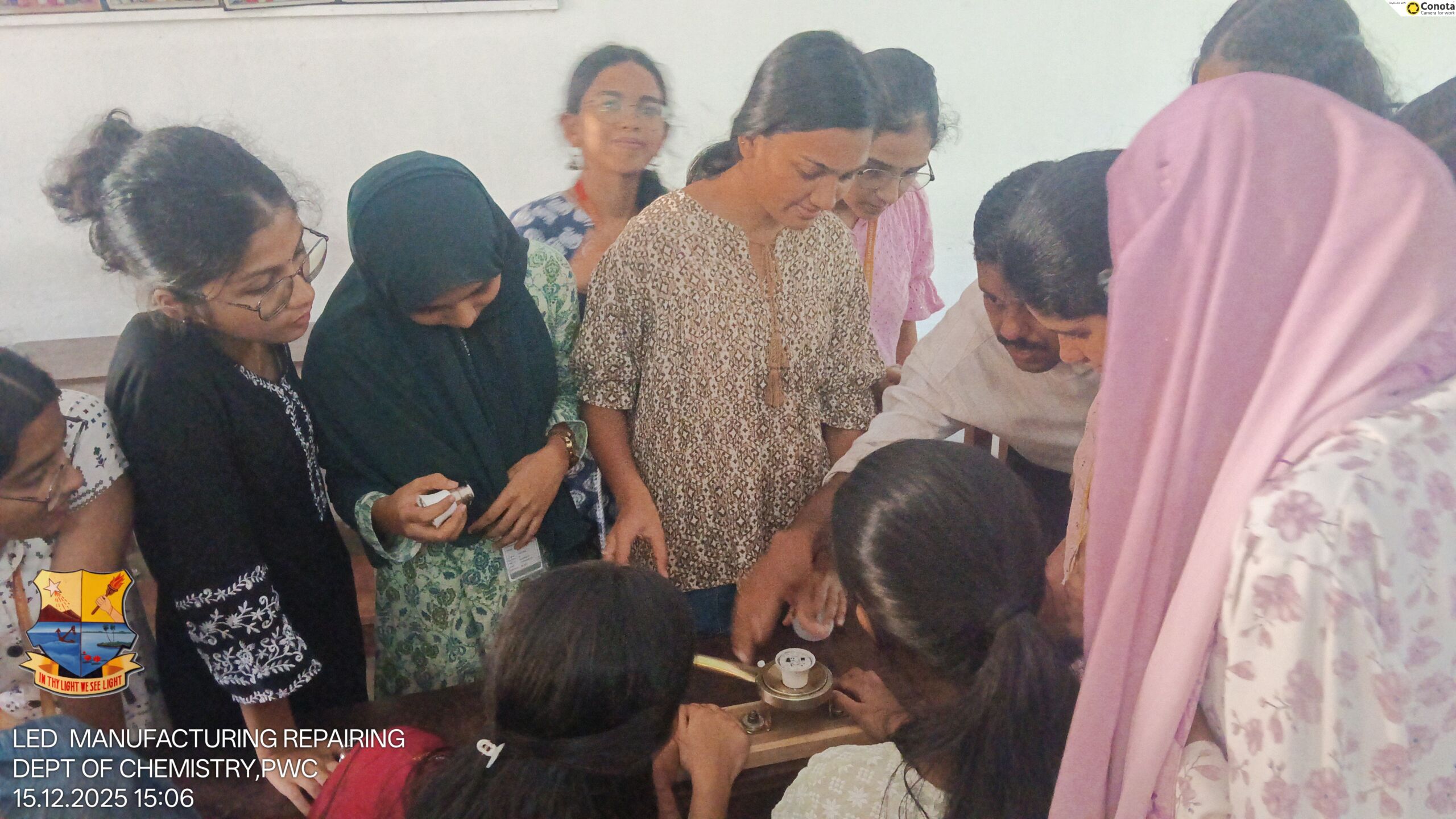 The Department of Chemistry conducted an “LED Bulb Manufacturing and Repairing Workshop” on 15/12/25 from 1:30 PM to 3:30 PM as part of Energy Conservation Day. The workshop was led by Mr. Sabir P., LED Trainer, Elight Industries, Malappuram, who explained the significance of energy conservation and demonstrated the process of LED bulb manufacturing and repairing. A total of 26 students from the first and second years attended the programme.