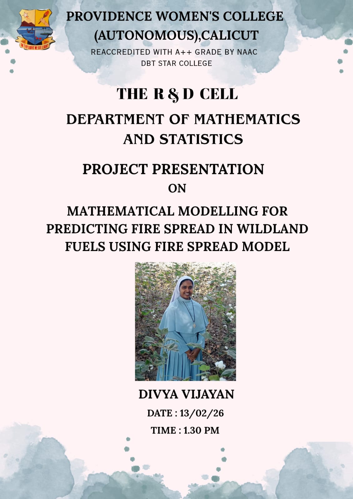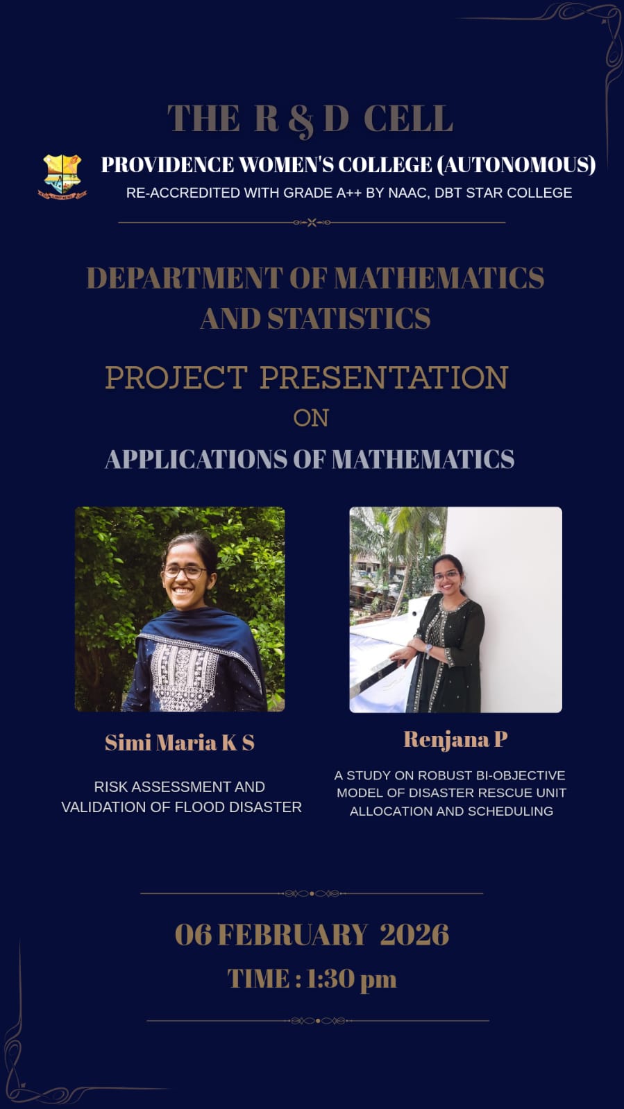 The Department of Mathematics and Statistics conducted project presentations for current UG third-year and second-year PG students, led by selected students from the 2025 batch. UG presentations were held on 13-02-2026 and PG presentations on 06-02-2026, both from 1:30 PM to 2:30 PM. A total of 24 UG students and 13 PG students attended the sessions.