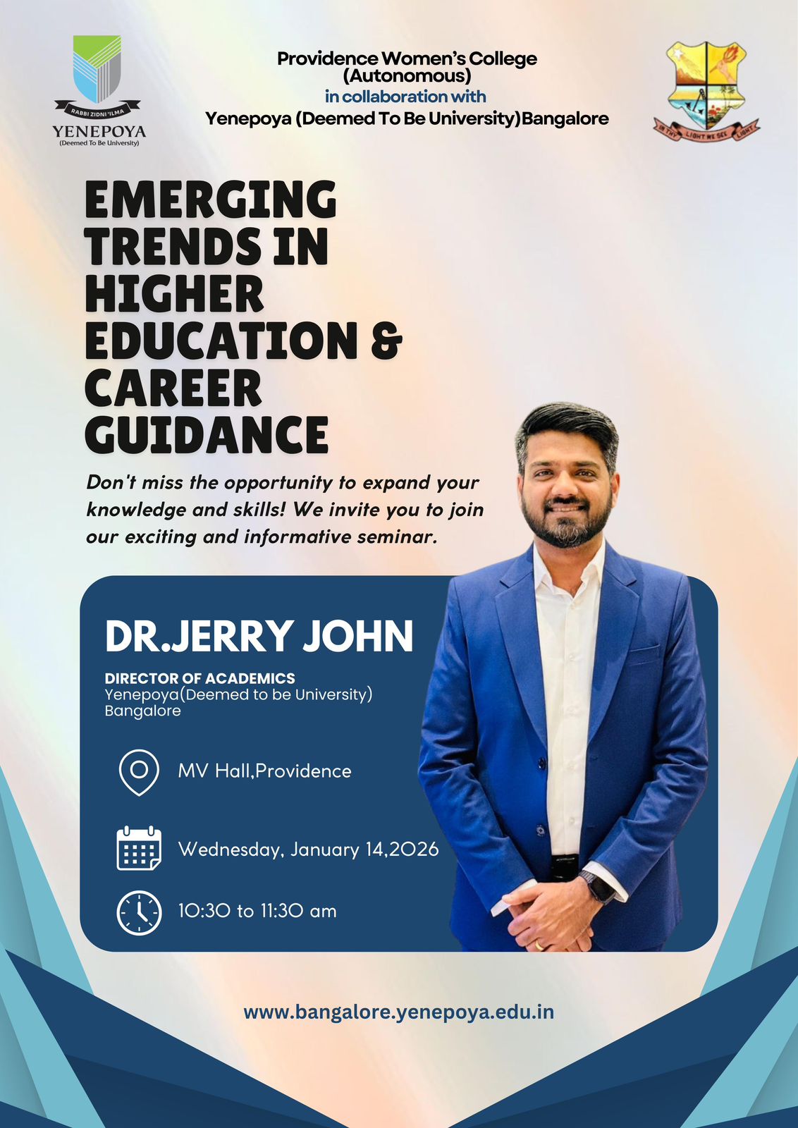 A seminar titled “Emerging Trends in Higher Education & Career Guidance” was conducted by the Career Guidance and Placement Cell of Providence Women’s College (Autonomous) in collaboration with Yenepoya (Deemed to be University), Bangalore on 14.01.2026. The session was led by Dr. Jerry John, Director of Academics, Yenepoya University, and highlighted recent developments in higher education and career pathways. A total of 68 students participated actively in the seminar. The Yenepoya team awarded certificates to all participants, marking the successful completion of the programme.