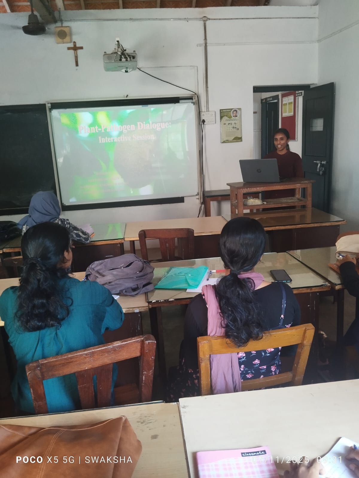 Plant–Pathogen Dialogue, an interactive session with students, was conducted on 07 November 2025 at 10.00 am in the 1st year M.Sc. Botany classroom of Providence Women’s College (Autonomous), Kozhikode. The session was handled by Ms. Maneesha K.KSCSTE Research Fellow, PG & Research Department of Zoology, Govt. College Madappally, Vatakara. The programme aimed to update students’ understanding of plant diseases, support their local plant disease documentation reports, and encourage research motivation through strong academic–research linkage. The session was informative and interactive, enabling students to gain practical insights into plant–pathogen interactions and fostering interest in research-oriented learning.