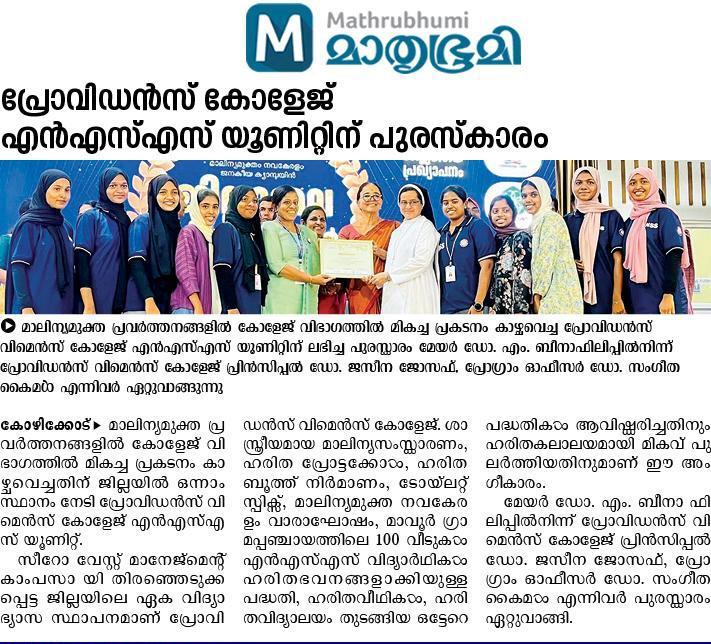 The NSS units of Providence Women’s College have been awarded First Place in Kozhikode district for Outstanding contributions to the Malinya Muktha Nava Keralam Campaign, instituted by the Suchitwa Mission, Kozhikode. The prestigious District Level Award was presented by Hon’ble Mayor Dr. Beena Philip at Jubilee Hall